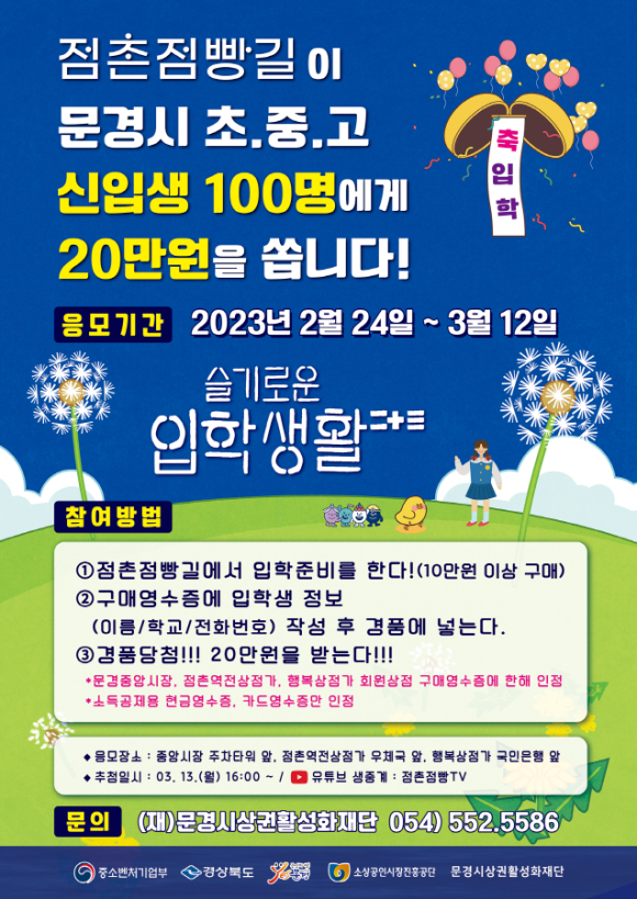 (재)문경시상권활성화재단은 점촌점빵길의 활성화를 도모하고 새로운 시작을 하는 신입생들을 응원하기 위해 2월 24일(금)부터 3월 12일(일)까지‘슬기로운 입학생활’행사를 진행한다고 밝혔다.