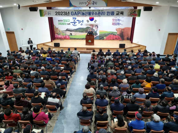 문경시농업기술센터(소장 이경호)는 2월23일(목) 관내 2023년도 GAP 인증 교육 대상 농가 및 신규 인증 희망농가 220명을 대상으로 농업기술센터 4층에서 GAP(농산물우수관리) 인증 교육을 실시하였다. GAP 인증제도는 농산물의 안전성 확보와 농업환경 보존을 위해 생산단계에서 판매단계까지의 농산식품 위해요소를 점검하고 안전관리체계를 구축해 소비자에게 안전한 농산물을 공급하는 것을 목표로 운영되는 것으로, 신규 및 인증 농가는 2년마다 2시간 이상 인증 교육을 이수해야 한다.