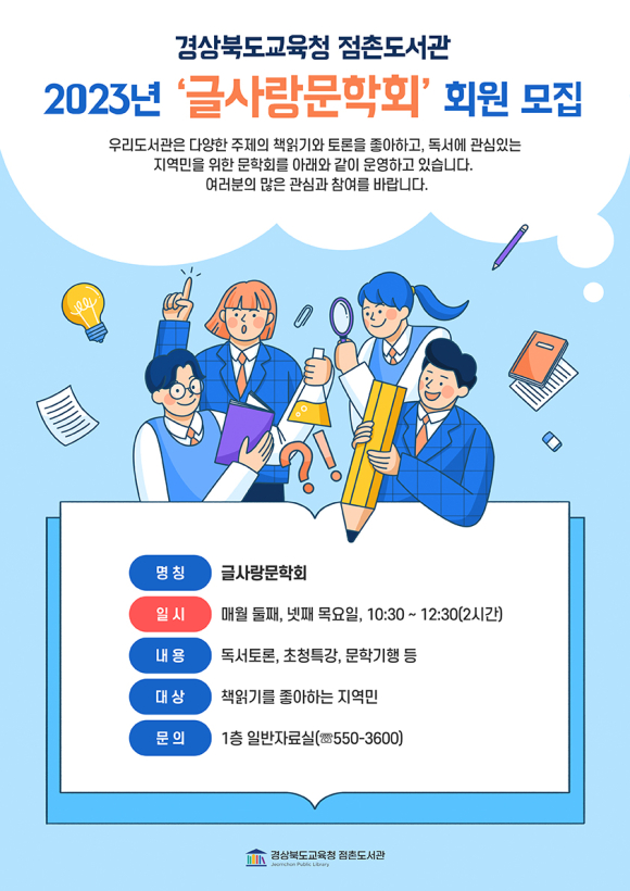 경상북도교육청 점촌도서관(관장 전만옥)은 지역주민들에게 열린 독서공간을 제공하고 함께하는 독서문화 가치를 창출하기 위해 글사랑문학회 신규회원을 모집한다.