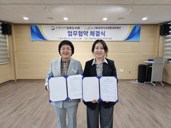 경상북도교육청 점촌도서관(관장 전만옥)은 3월 21일(화) 문경시상권활성화재단(이사장 신현국)과 상호간 신뢰와 우호 관계를 바탕으로 협업 관계 구축을 위해 업무 협약을 체결했다.