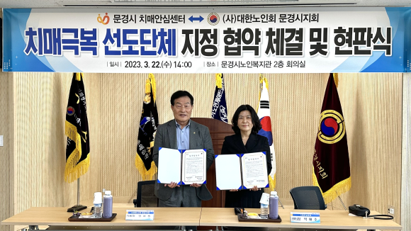 문경시 치매안심센터는 3월 22일 치매예방관리사업의 원활한 업무추진을 위해‘(사)대한노인회 문경시지회’와 업무 협약(MOU)을 체결하고, 치매극복 선도단체로 지정하는 현판식을 하였다.