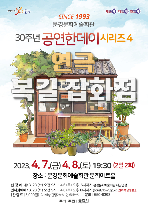 문경문화예술회관에서 매월 2째주에 추진중인 공연한데이 사업의 일환으로 감동과 웃음이 있는 연극‘복길잡화점’을 4월 7일(금), 8일(토) 오후 7시 30분 (2일2회)에 문희아트홀에서 개최한다.
