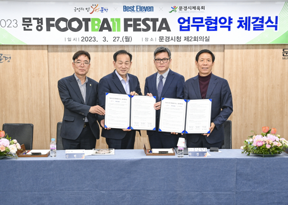 문경시(시장 신현국)에서는 3월 27일 유소년 축구 활성화의 일환으로 국내 유일의 축구 전문지 ‘베스트 일레븐’과 「2023 문경 풋볼 페스타」협약식을 가졌다. 협약식에는 베스트 일레븐 박정선 대표이사, MBC꿈나무축구재단 김진국 이사장, 안동MBC 권순태 국장이 참석하여 유소년 축구 활성화를 위해 문경시와 함께 뜻을 모았다.
