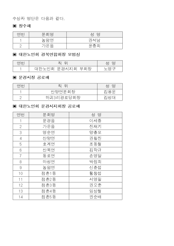 정기총회에 앞서 농암면 권석남(105세) 어르신과, 가은읍 윤종희(101세) 어르신에게 장수패를 전달하고, 문경시장 공로패 3명, 대한노인회 경북연합회장 모범상 1명, 대한노인회 문경시지회장 공로패 14명에게 상패를 수여했다.