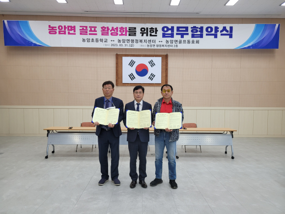 농암면(면장 윤상혁)은 농암초등학교(교장 김조한), 농암면골프동호회(회장 여수용)와 3월 31일 열린 금요회 회의를 통해 농암면 골프 활성화와, 재능기부를 통한 초등학교 특성화 교육 및 인재 양성을 목표로 하는 협약을 체결하였다.
