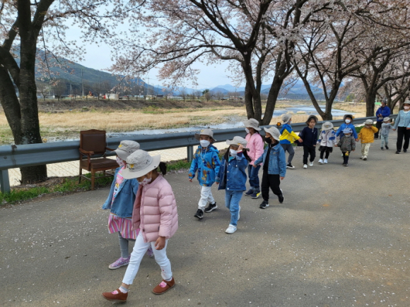 유치원 원아들과 벚꽃길을 나서자 벚꽃비가 바람에 너무 아름답게 흩날려서 인솔 교사들과 아이들 모두 환호성을 질렀다. 즐거운반 황OO어린이는 “봄꽃을 보니 마음이 따뜻하고 예뻐지는 것 같아요.”라고 소감 발표해 주기도 하였다.