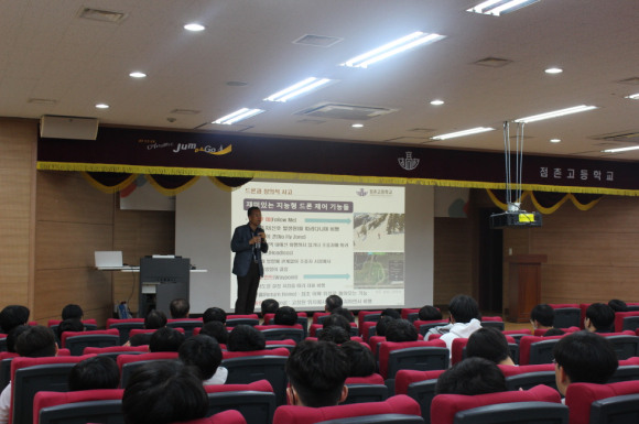 점촌고등학교(교장 함석돈)에서는 4월 5일 수요일 오후 문희재에서 1학년 학생들을 대상으로 전문직업인 초청 특강으로 경희대학교 전자공학과 정연모 명예교수님을 초빙하여 진로·진학 특강 “드론과 창의적 사고”를 주제로 강연을 실시하였다.