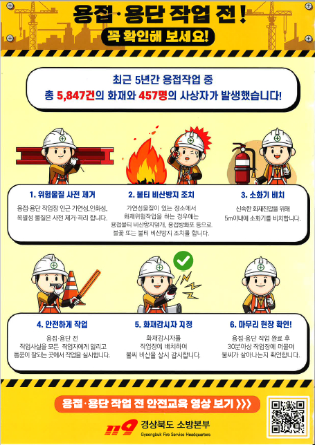 배종혁 문경소방서장은 “공사장 관계자는 용접 작업 시 철저한 안전수칙을 준수하여 화재 예방에 최선을 다 해달라”고 전했다. |