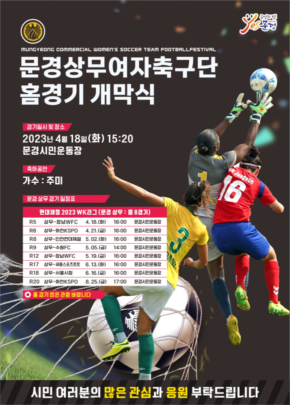 올해부터 새롭게 문경시로 연고지를 이전한 국군체육부대 상무여자축구팀은 지난 3월 24일 시작된 ‘현대제철 2023 WK리그’부터 “문경 상무”로 출전하고 있으며, 오는 4월 18일은 문경 상무가 문경시에서 처음으로 치루는 홈경기로서 15시부터 육군 의장대의 화려한 공연을 시작으로 선수들의 사인볼 증정을 거쳐 16시부터 창녕WFC와의 역사적인 홈경기 개막전을 치를 예정이며, 하프타임에는 미스트롯 출신의 인기가수 주미의 신나는 축하공연도 마련되어 있다.
