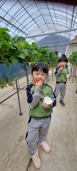 봄 내음 가득한 정원에서 딸기 따는 방법을 농장 아저씨께서 친절하게 유아들에게 설명해주셨다. 깨끗하고 싱싱한 딸기가 탐스럽게 주렁주렁 달려있는 모습을 직접 관찰하고 고사리 같은 손으로 새콤달콤한 딸기를 따 보았다. 호기심 가득한 눈으로 딸기의 꽃과 잎, 열매를 관찰하고 딸기 색깔이 다른 것에 대해 궁금해 하기도 하였다. 빨갛고 탐스러운 딸기를 따며 잘 익은 딸기를 고르기 위해 신중을 기하는 모습도 보였다. 딸기로 퐁듀 만들기를 할 때 먹고 싶어서 침을 꼴칵 삼기기도 하였다.
