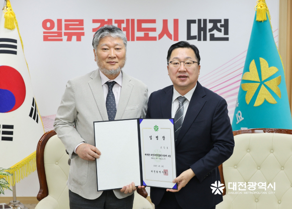| ↑↑ 권득용 대전디자인진흥원장(왼쪽)과 이장우 대전시장 |