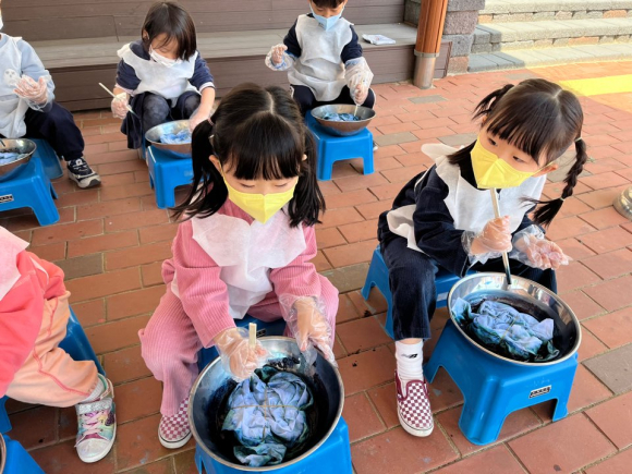 유아들은 교사의 도움을 받아 하얀 인견 홑이불을 돌돌 말고 끈으로 묶어 염색을 하기 위한 준비를 하였다. 홑이불을 염색물에 담그고 조물조물 한참 주무르다 보니 어느새 흰색이 쪽빛으로 변하는 것을 보며 신기해하였다.
