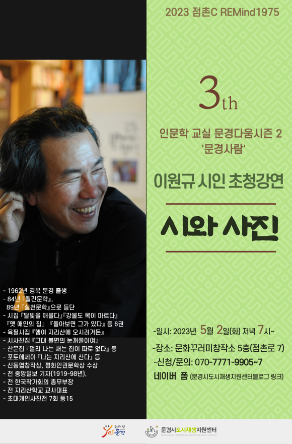 문경시도시재생지원센터는 5월 2일(화) 저녁 7시 문화꾸러미창작소 5층에서 이원규 시인을 모시고 ‘시와 사진’라는 주제로 문경사람 초청강연 3강을 진행한다.