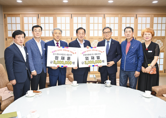 문경시는 7일 정재훈 대표이사(㈜운호 엔지니어링), 최주원 이사(㈜진원피앤씨)가 고향의 발전을 위해 각 300만원을 기부하였다고 밝혔다.