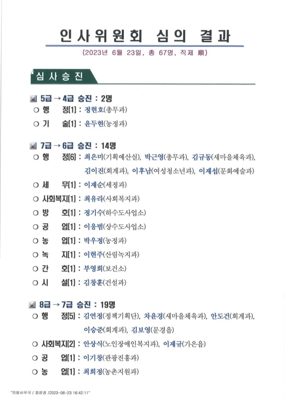 문경시청 인사이동조서(승진), 6.23자 총67명