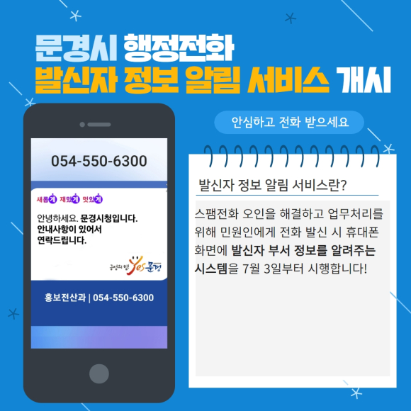 문경시는 시민과의 원활한 소통 및 행정효율성 제고를 위해 익월 3일부터 행정전화 발신정보를 표시하는 발신정보알리미 서비스를 도입하여 운영한다고 밝혔다.