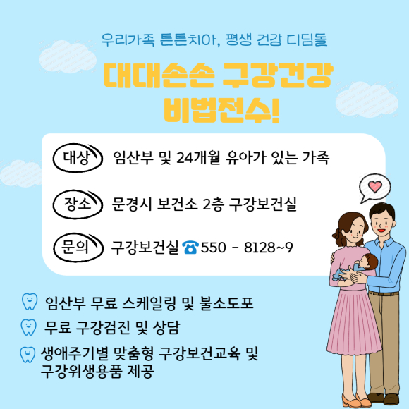 문경시는 7월부터 임산부와 24개월 이하 유아가 있는 가정을 대상으로 「대대손손 구강건강 안심서비스」를 지원한다.
