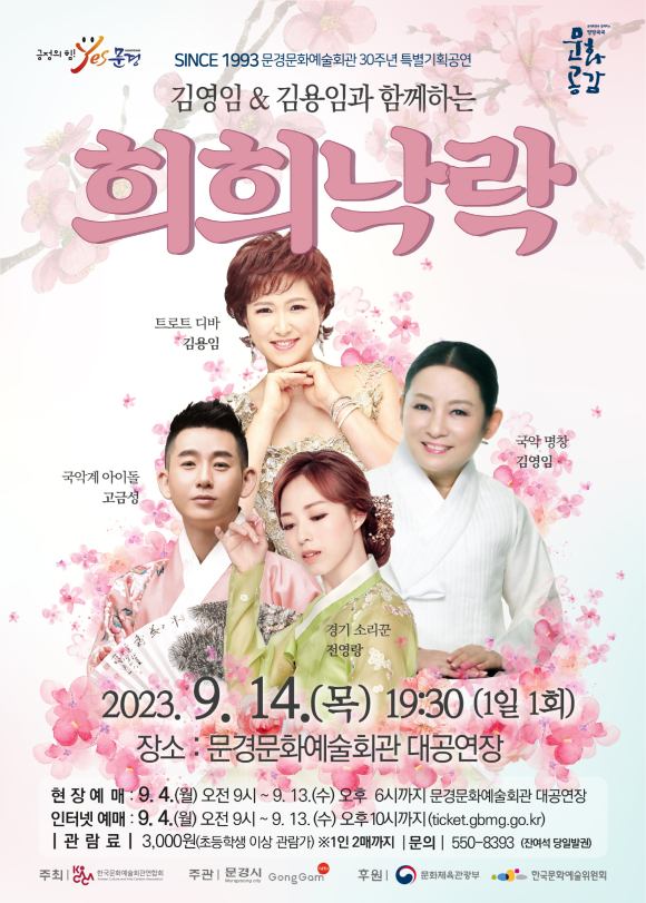 문경문화예술회관은 문화예술회관 30주년을 기념하고 일상생활에 지친 문경시민들을 위해 국악 명창 김영임과 트로트 여왕 김용임이 함께하는 ‘희희낙락’ 공연을 오는 9월 14일(목) 오후 7시 30분 문경문화예술회관 대공연장에서 막을 올린다.