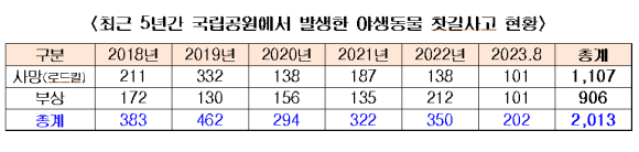 최근 5년간 국립공원에서 로드킬 등 야생동물 찻길사고가 2,013건 발생한 것으로 나타났다.