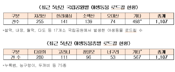 특히, 찻길 사고로 죽은(로드킬) 동물은 최근 5년간 총 1,107마리에 달했다. 사고 최다 발생 공원은 지리산공원(255건)이었으며, 이어 한려해상 141건, 소백산 139건, 오대산 74건 순이었다. 로드킬 최다 발생동물은 다람쥐 280건, 고라니 111건, 청설모 96건, 너구리 53건 순이었다.
