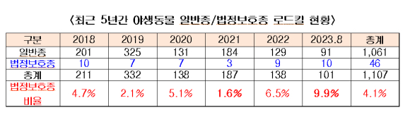 국립공원 야생동물 로드킬은 2021년을 기준으로 점차 감소 추세에 있지만, ‘법정보호종’ 야생동물 로드킬은 지속적으로 발생하고 있다. 야생동물 법정보호종 비중은 2021년 1.6%에서 올해 8월 기준 9.9%를 차지했으며, 특히 수달, 담비 등 멸종위기종 또는 천연기념물 야생동물 로드킬도 46건 있었다.