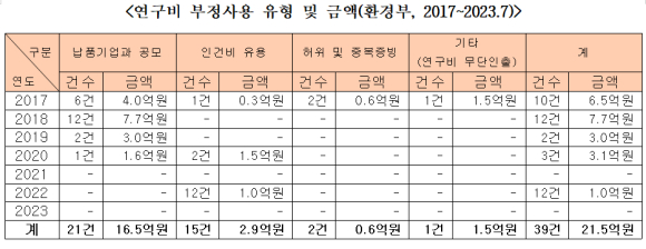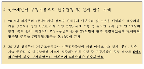 특히, 연구개발규정 위반 유형 중‘사업비 부정사용’의 경우, 납품기업과 공모하여 사업비를 횡령하는 경우가 21건(환경부 전체 39건)으로 환수 결정금액은 16억5천만원에 달했으며, 인건비를 유용하거나 허위 또는 중복으로 증빙하는 경우도 있었다.