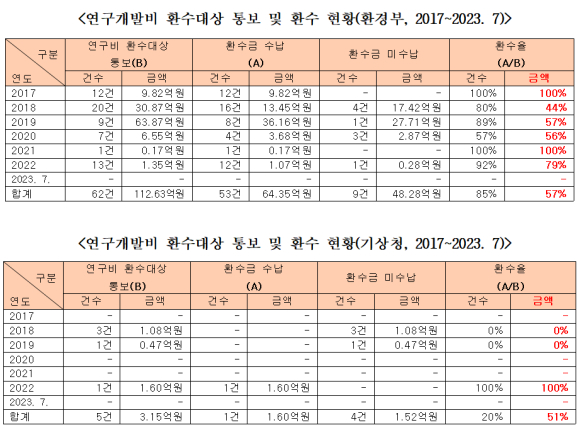 부정사용 연구비에 대한 환수율도 저조했다. 환경부가 연구비 환수대상으로 통보한 112억원(62건) 중 약 64억원(57%)이 환수되었으며, 기상청의 경우 환수대상 금액 3억1천만원 중 절반 수준인 1억6천만원(51%)이 환수된 것으로 나타났다.
