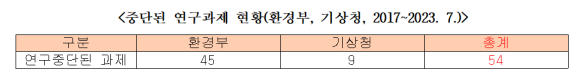 한편, 연구개발과제가 연구기관 사정으로 중도에 중단되거나 과제 종료 이후 사업화에 성공하는 사례가 저조한 점도 문제로 나타났다. 연구기관의 ‘경영악화’, ‘불성실한 연구수행’, ‘과제 수행 포기’ 등의 사유로 환경부는 45건, 기상청은 9건의 연구과제가 중단되었다.