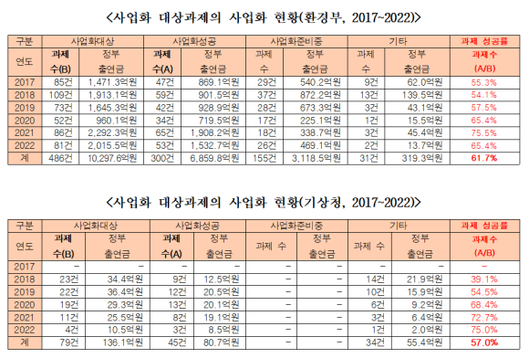 사업화에 성공한 과제의 경우, 환경부는 전체 사업화대상 과제 486건 중 300건(62%), 기상청은 79건 중 45건(57%)이었다.