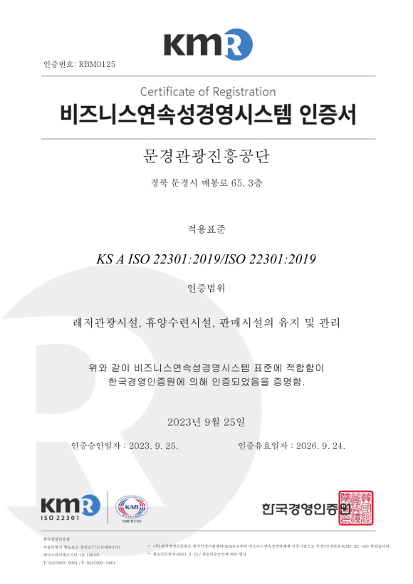 문경관광진흥공단(이사장 신필균)은 재해경감관리체계 구축을 위한 비즈니스연속성경영시스템(BCMS) 국제표준인증(ISO 22301)을 획득했다고 25일 밝혔다.