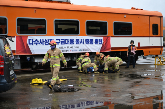 문경소방서(서장 배종혁)는 9. 27.(수) 마성면 외어리 ㈜ 성신RST(철도차량 제작기업)에서 교통사고에 따른 열차탈선으로 인한 다수사상자 구급대응훈련을 실시 했다. 다수사상자란 동시에 다수의 사상자가 발생하였거나, 발생할 우려가 있어 응급의료 제공을 위해 별도로 의료자원 동원 등의 조치가 필요한 사고를 말한다.