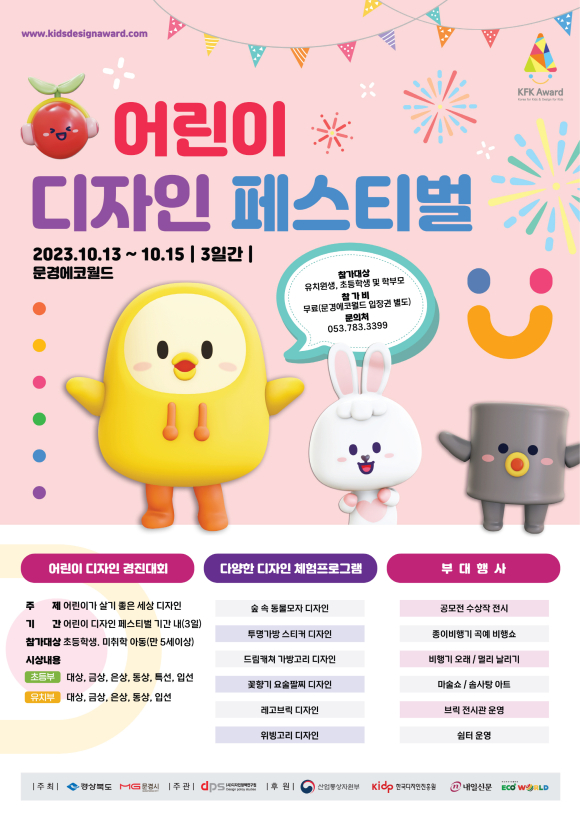 문경시는 10월 13일부터 15일까지 문경에코월드에서 어린이들을 위한 2023 어린이 디자인 페스티벌과 제11회 어린이제품 디자인 공모전 시상식을 개최한다.