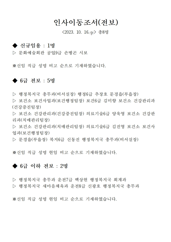 문경시청, 2023.10.16.字 인사이동조서(전보)