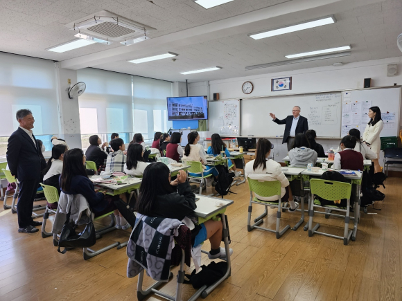 문경여자중학교(교장 서재원)는 2023. 10. 25. (수) 재방한한 전 미국 평화봉사단원인 James Thompson씨와 문경여자중학교 3학년 학생들과의 간담회를 실시하여, 우리나라의 발전상과 현재의 한국 문화에 대해 우정어린 대화의 시간을 가졌다.