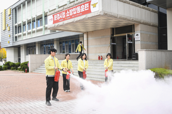 문경시는 9일 문경시청 전정에서 청사 화재 발생 시 초기진화 및 대피 등 비상 대응체계 확립을 위해 문경소방서(모전119안전센터)와 합동 소방훈련을 실시했다.