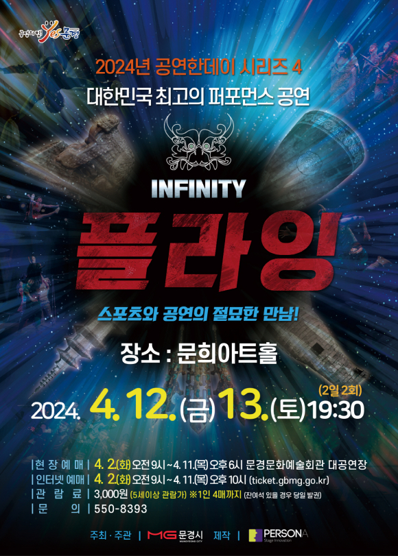 문화예술회관에서는 2024년 공연한데이 시리즈 4탄으로 2011년 경상북도와 경주시가 공동 제작해 연극-뮤지컬 부문에 크고 작은 각종 상을 휩쓸며 경상북도 대표 웰메이드 공연으로 자리잡은 뮤지컬‘인피니티 플라잉’ 공연을 4월 12일(금) 19:30, 13일(토) 19:30(2일2회)에 문희아트홀에서 개최한다.