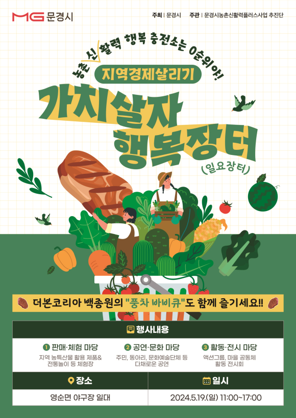 문경시 농촌 신활력플러스사업추진단은 문경시의 특화자원 융복합을 통한 스포츠 식품 메카 육성이라는 비전을 달성하기 위하여 다양한 전략으로 추진 중인 신활력플러스사업 액션그룹을 대상으로 2024년 5월 19일(일) 신활력장터를 영순면 야구장 잔디광장에서 개최 예정이라고 밝혔다.
