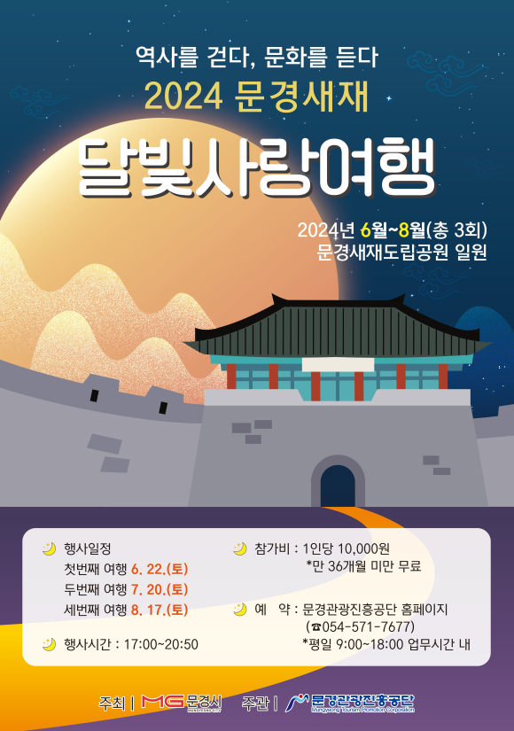 2005년부터 시작해 올해로 18회를 맞은 「2024 문경새재 달빛사랑여행」은 문경시가 주최하고 문경관광진흥공단이 주관하며, 매달 보름 가까운 토요일 환한 달빛 아래 문경새재 도립공원을 걸으며 다양한 체험 프로그램과 공연을 즐길 수 있는 문경시 대표 야간 관광 프로그램이다.