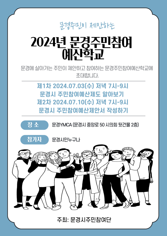 2024 문경주민참여예산학교는 오는 7월 3일(수)과 10일(수), 2주에 걸쳐 저녁 7시부터 9시까지 문경YMCA 건물 회의실(시의회 뒷 건물)에서 개최될 예정이다.