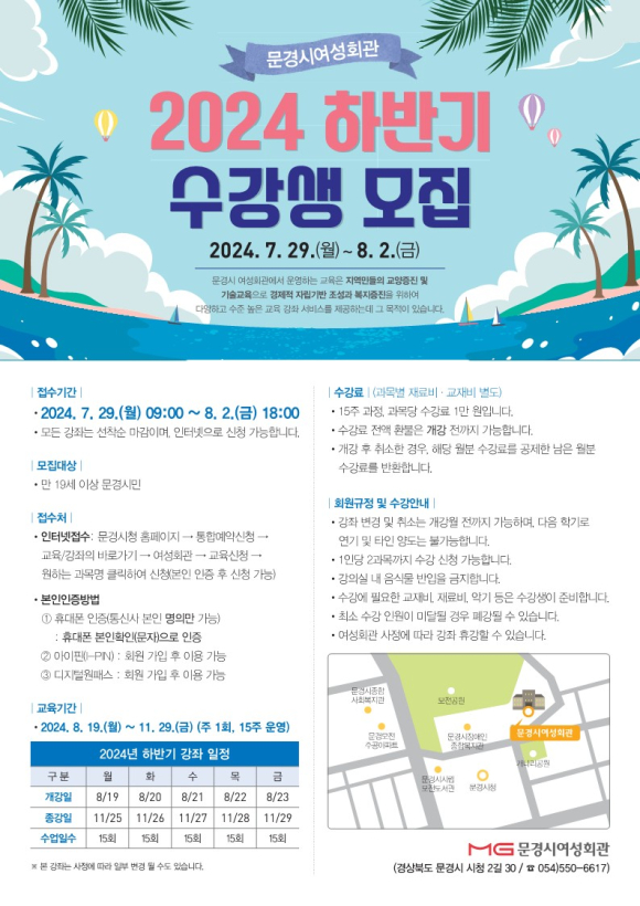 문경시 여성회관은 2024년 하반기 여성회관 교육생을 7월 29일부터 8월 2일까지 선착순으로 모집한다.
