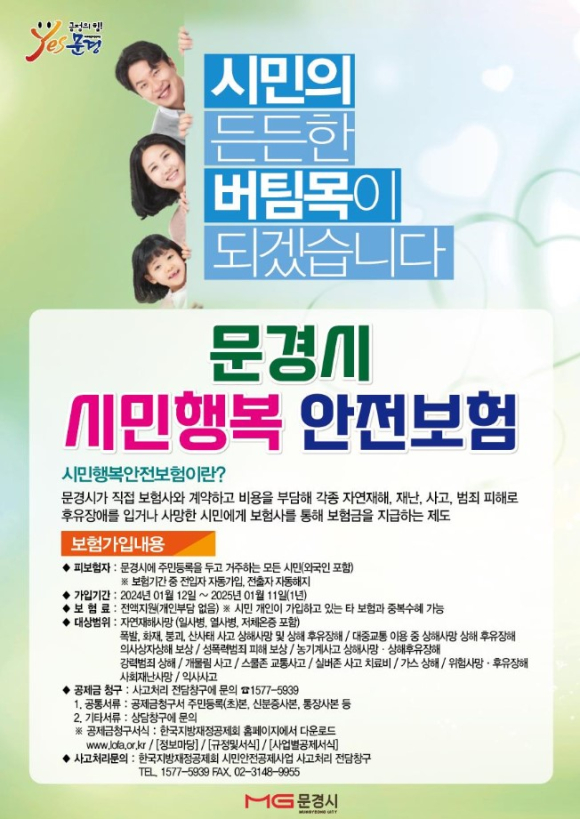 문경시에 주민등록을 두고 거주하는 시민이라면 누구나 별도 절차 없이 가입돼 있으며, 보험금 청구는 한국지방재정공제회(www.lofa.or.kr) 홈페이지에서 신청서를 다운받아 작성 후 보험사에 직접 청구(☎1577-5939)하면 된다.