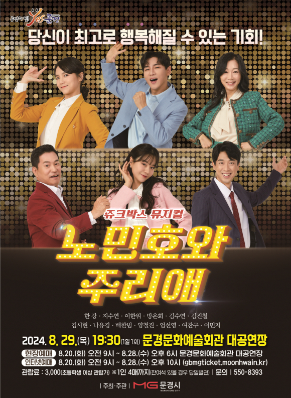 문경문화예술회관에서는 쥬크박스 뮤지컬 노민호와 주리애 공연을 8월 29일(목) 19:30(1일1회) 문화예술회관 대공연장에서 개최한다.