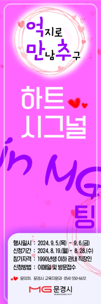 문경시는 결혼 친화적 공감대 확산과 사회적 분위기를 조성하고자 관내 결혼 적령기 미혼남녀를 대상으로 만남 주선행사인“하트시그널 in MG팅”을 9월에 개최한다.