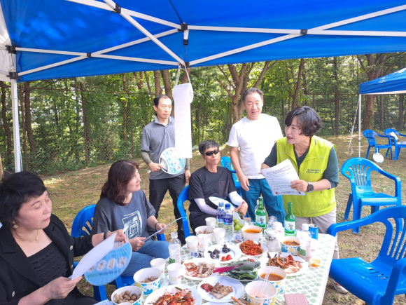 | ↑↑ 동창회에 참석한 호계중학교 동문들에게 김진영호계면장은 제2중앙경찰학교가 유치될 수 있도록 힘을 모아달라고 각 기수별로 홍보하고 있다. |