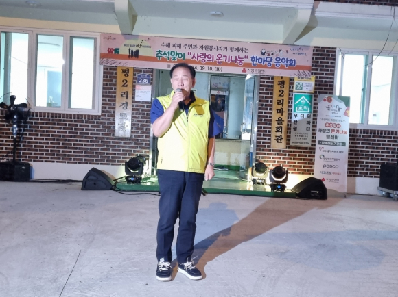 경상북도개발공사, 포스코, 에코프로 머티리얼즈, 경북사회복지공동모금회의 후원으로 추진된 이번 사업은 동로면 행정복지센터(면장 송영복)의 협조를 받아 지난해 집중호우로 인해 많은 피해를 입은 수평2리 마을주민 대상으로 훈훈하고 정이 넘치는 추석명절 보내기의 일환으로 한마당 음악회를 진행했다.