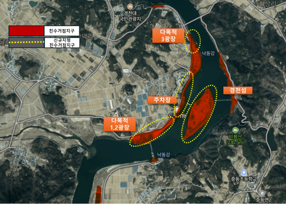 이번 친수거점지구 지정으로 낙동강변의 경천섬(211,683㎡) 및 다목적 1,2,3 광장(38,871㎡), 주차장(7,000㎡) 등 약 8만 평 부지에 체육시설, 오토캠핑장, 휴게음식점 및 각종 편의시설을 대규모로 개발할 수 있게 되었다.