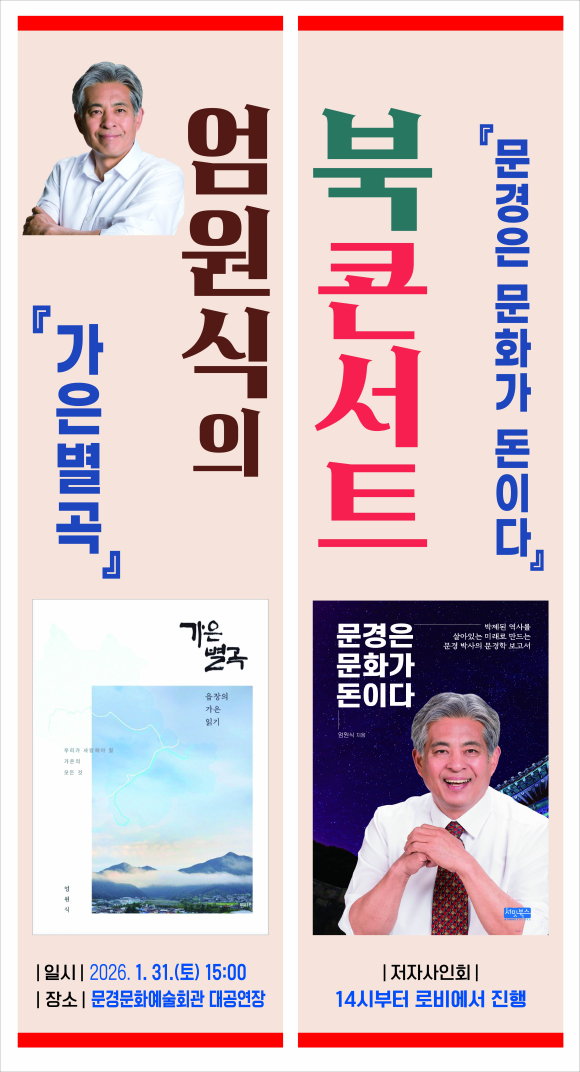 [행사 개요] ○ 행사명: 엄원식 북콘서트 “문경의 뿌리에서 문화의 돈을 캐다” ○ 일 시: 2026년 1월 31일(토) 15:00 (식전 사인회 14:00부터) ○ 장 소: 문경문화예술회관 대공연장 ○ 주요내용: 식전: 저자 사인회 및 포토존 운영 1부: 오프닝 공연(바이올린 고경남), 축사 및 저자 영상 소개 2부: 북 토크쇼, 저자에게 바란다 소통시간 3부: 비전 스피치, 종이비행기 퍼포먼스 |