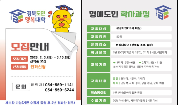 문경시는 시민들에게 체계적이고 수준 높은 평생학습 기회를 제공하기 위해 2026년『경북도민행복대학 문경시캠퍼스』명예학사과정 입학생을 2월 3일(화)부터 3월 10일(화)까지 선착순 모집한다.